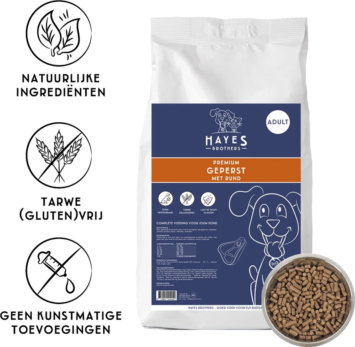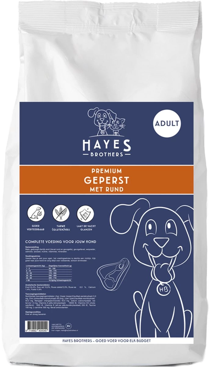 Hayes Brothers Premium Geperst is een premium koudgeperste brok met rund en kip voor elke volwassen hond.