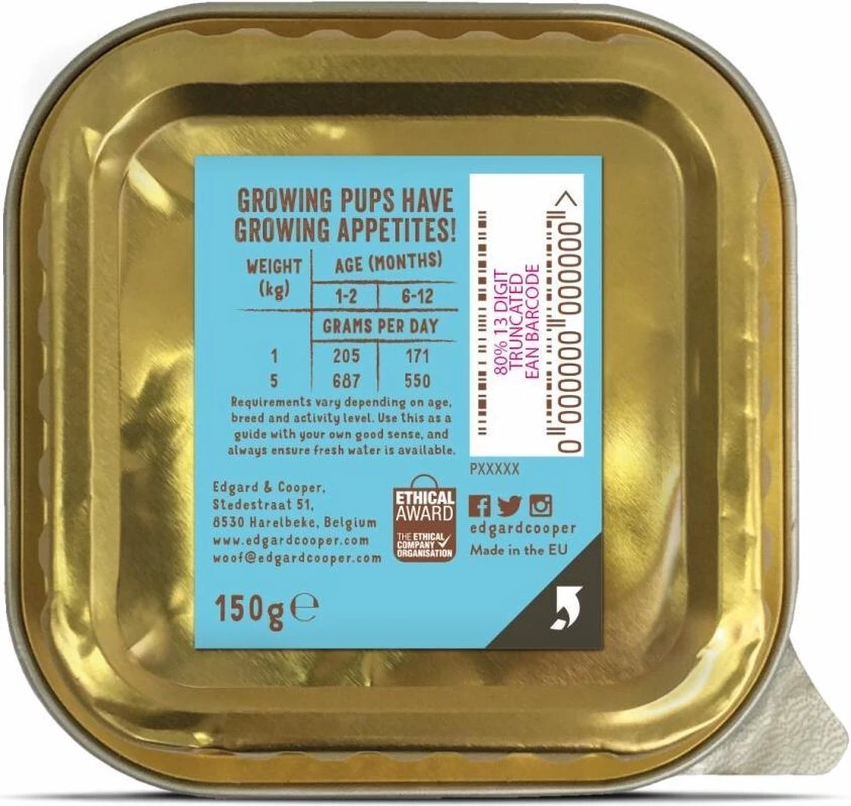 Pups lijken altijd honger te hebben. Logisch, want ze groeien als kool. En daarvoor hebben ze veel energie nodig. Aan deze verrukkelijke combinatie van kip en vis kan geen enkele pup weerstaan. In een wip en een slok is die kom leeg en dat buikje vol. Natuurlijk doet Edgard & Cooper je pup ook echt goed: kip helpt een sterk immuunsysteem opbouwen en vis bevat veel omega 3 voor een (o)megazachte vacht en een gezonde huid.
