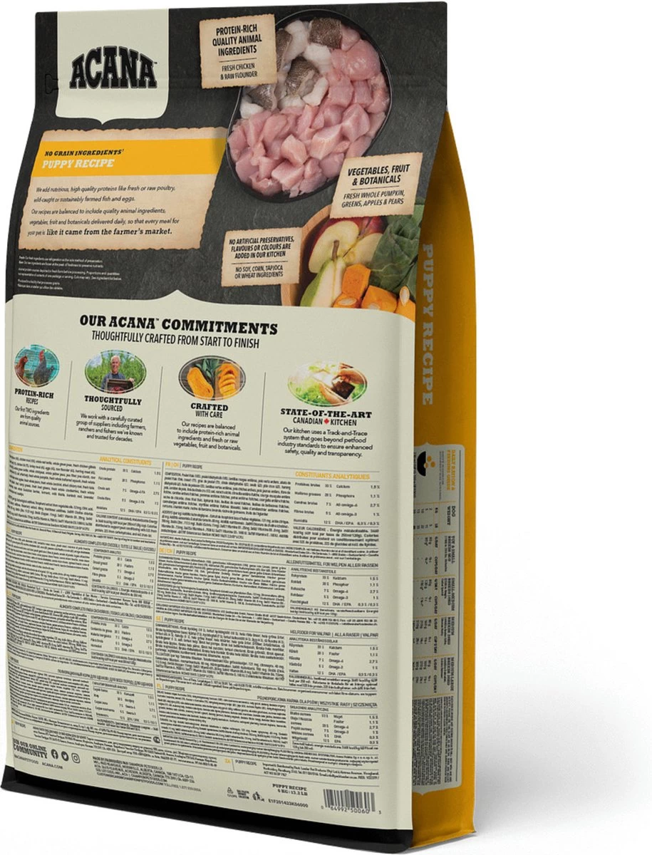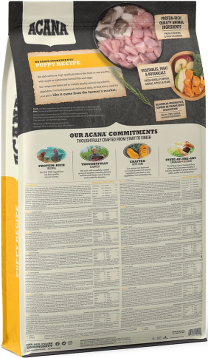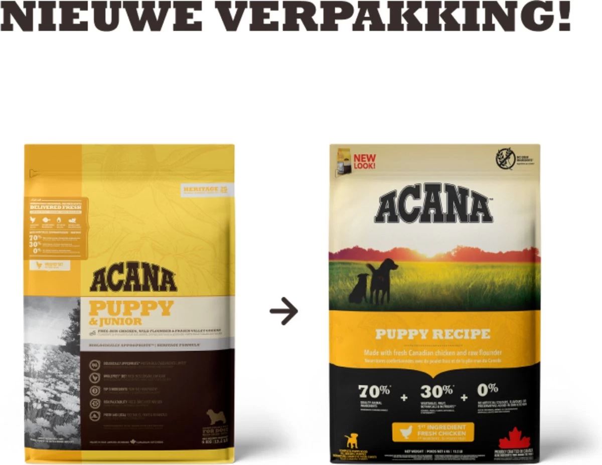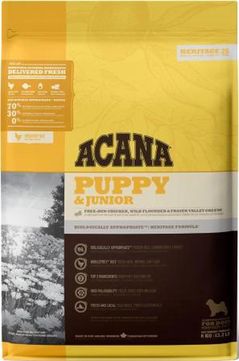 Acana Heritage Puppy & Junior 6kgBereid in onze gecertificeerde keukens in Canada is ACANA PUPPY & JUNIOR rijk aan lokaal gefokte scharrel kip, scharrel eieren, in het wild gevangen platvis, zongerijpt fruit en groenten ? geleverd rijk aan voedingsstoffen en door boeren en telers uit onze regio zodat uw puppy gezond sterk en gelukkig kan zijn. Bekijk onze ingrediënten en wij denken dat u tevreden bent.