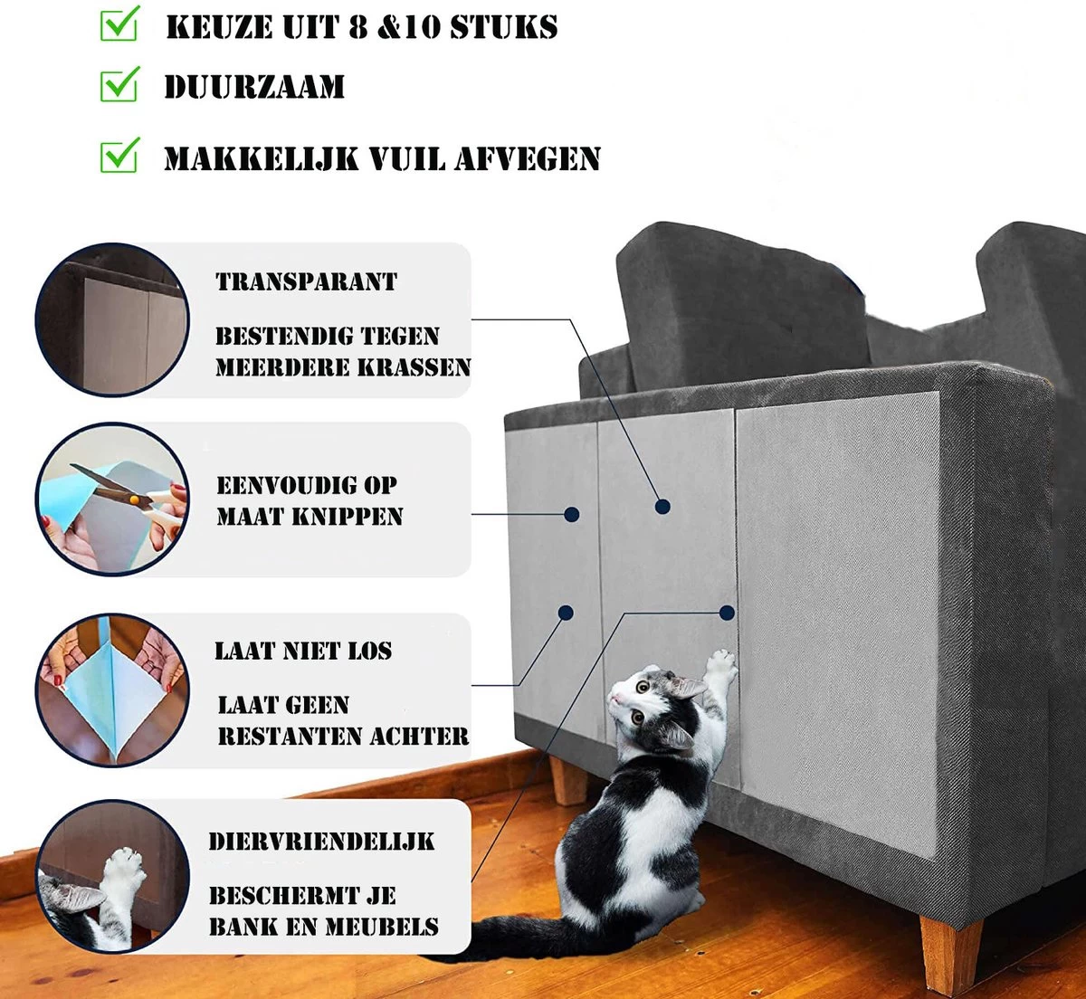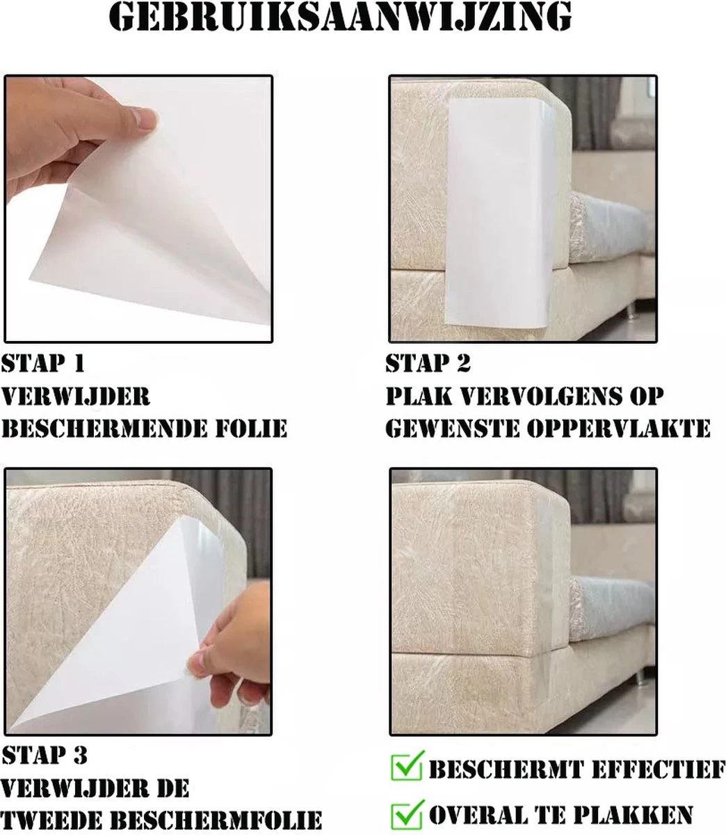 100% veilig – De anti-krab vellen zijn geproduceerd met lijm van medische kwaliteit die niet giftig is, je meubel niet beschadigt en 100% veilig is voor je huisdieren.