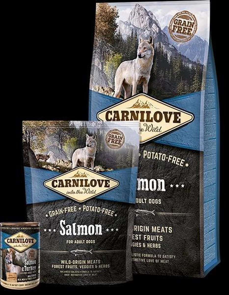Carnilove into the wild: Adult met zalm (12 kg) is een aardappel- en granenvrij hondenvoeding.