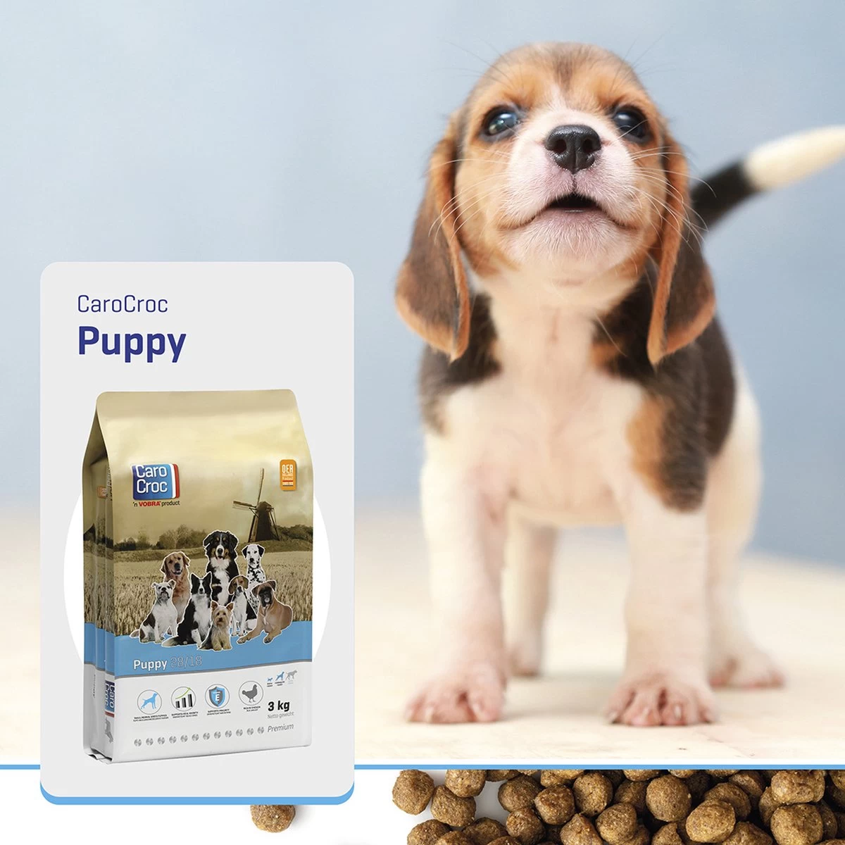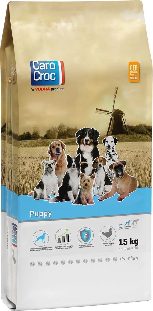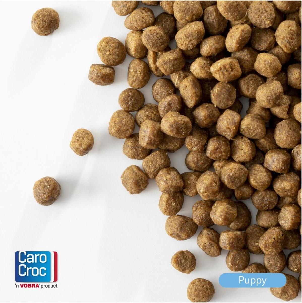 Geëxpandeerde, krokante brokjes. Een licht verteerbare complete voeding voor uw pups en jonge opgroeiende honden van kleine rassen. Carocroc Puppy bevat extra Omega 3 en 6. Een voeding die alle bouwstoffen bevat welke nodig zijn voor pups en jonge opgroeiende honden. Met “Carocroc Puppy bent u verzekerd van een veilige en probleemloze opfok. Carocroc Puppy kunt u verstrekken vanaf de 3e levensweek.