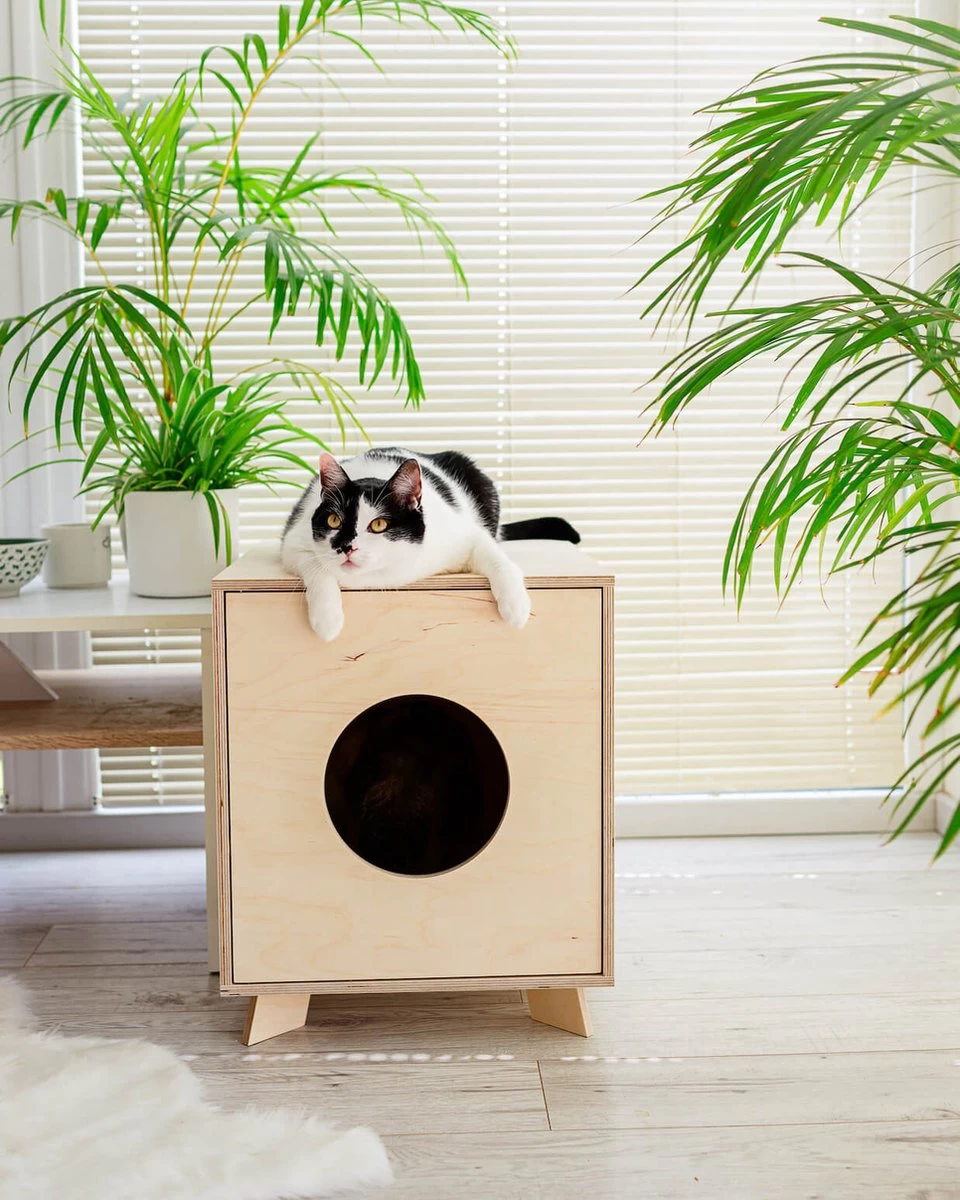 Dit houten decoratieve kattenmeubel past perfect in uw huis. Het warme en moderne ontwerp van deze handgemaakte houten kattenbak kast zal een mooie aanvulling zijn in elke kamer. Je kunt het ook gebruiken als een perfect huisje, een stijlvolle schuilplaats die als bijzettafel of als nachtkastje in je slaapkamer kan dienen. Leg gewoon een leuk kussen of een klein kattenbed in de kast en dit kattenmeubel wordt de nieuwe favoriete hangout van je kat!