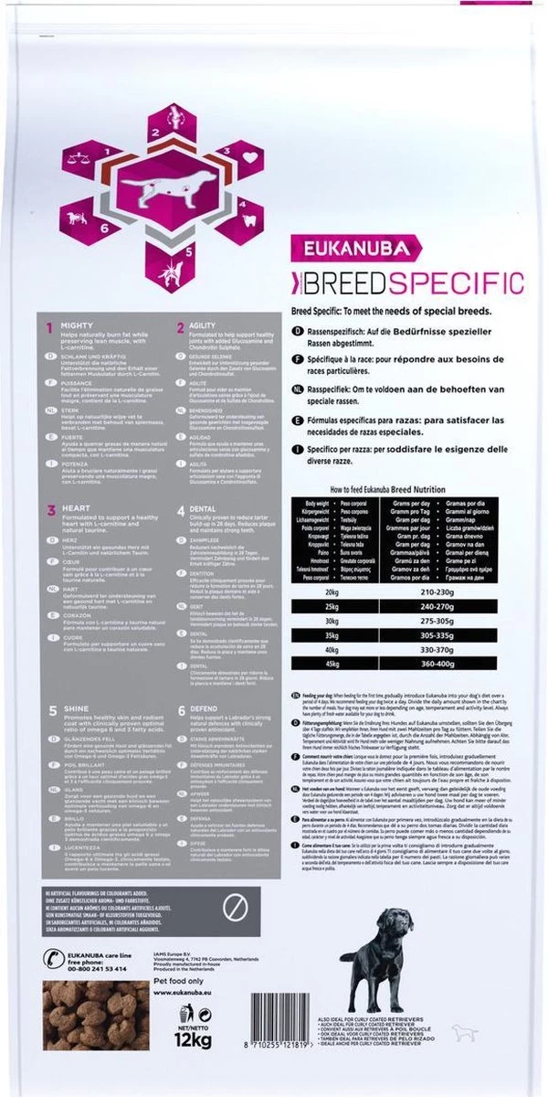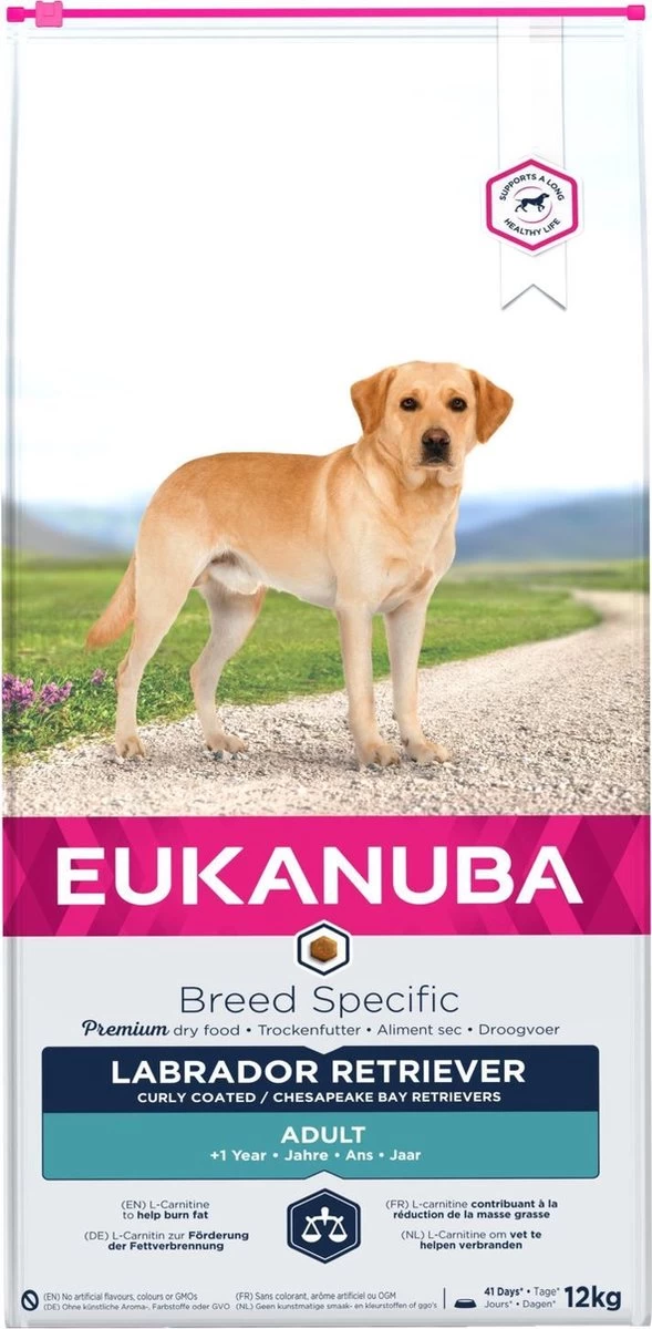 Eukanuba’s beste droge hondenvoeding voor volwassen labrador retrievers, ook ideaal voor curly coated- en Chesapeake Bayretrievers, bevat L-carnitine en natuurlijke taurine, twee belangrijke voedingsstoffen om het hart van uw hond gezond te houden. De speciaal afgestemde hoeveelheid L-carnitine helpt uw hond bovendien op natuurlijke wijze vet te verbranden. Dit rasspecifieke dieet is samengesteld met toegevoegde glucosamine en chondroïtinesulfaat voor gezonde gewrichten. Ook bevat het antioxidanten waarvan klinisch bewezen is dat ze een sterke natuurlijke weerstand van uw hond bevorderen, en omega-6- en omega-3-vetzuren die goed zijn voor een gezonde huid en een glanzende vacht. Met prebiotica en bietenpulp, waarvan klinisch is bewezen dat ze de spijsvertering bevorderen, draagt dit hondenvoer ook bij aan een gezonde spijsvertering en een optimale opname van voedingsstoffen. Dierlijke eiwitten helpen de spieren sterk en soepel te houden en calcium is goed voor sterke botten. De rasspecifieke voeding van Eukanuba is ontwikkeld in samenwerking met dierenartsen, wordt aanbevolen door topfokkers en is bereid met ingrediënten van de hoogste kwaliteit om uw hond een 100% volledig en uitgebalanceerd dieet te geven. Ieder dieet van Eukanuba Adult droge hondenvoeding bevat de 3D DentaDefense-technologie en reinigt daardoor met iedere hap, vermindert de opbouw van tandsteen tot wel 80%* en helpt uw hond een gezond gebit te houden.