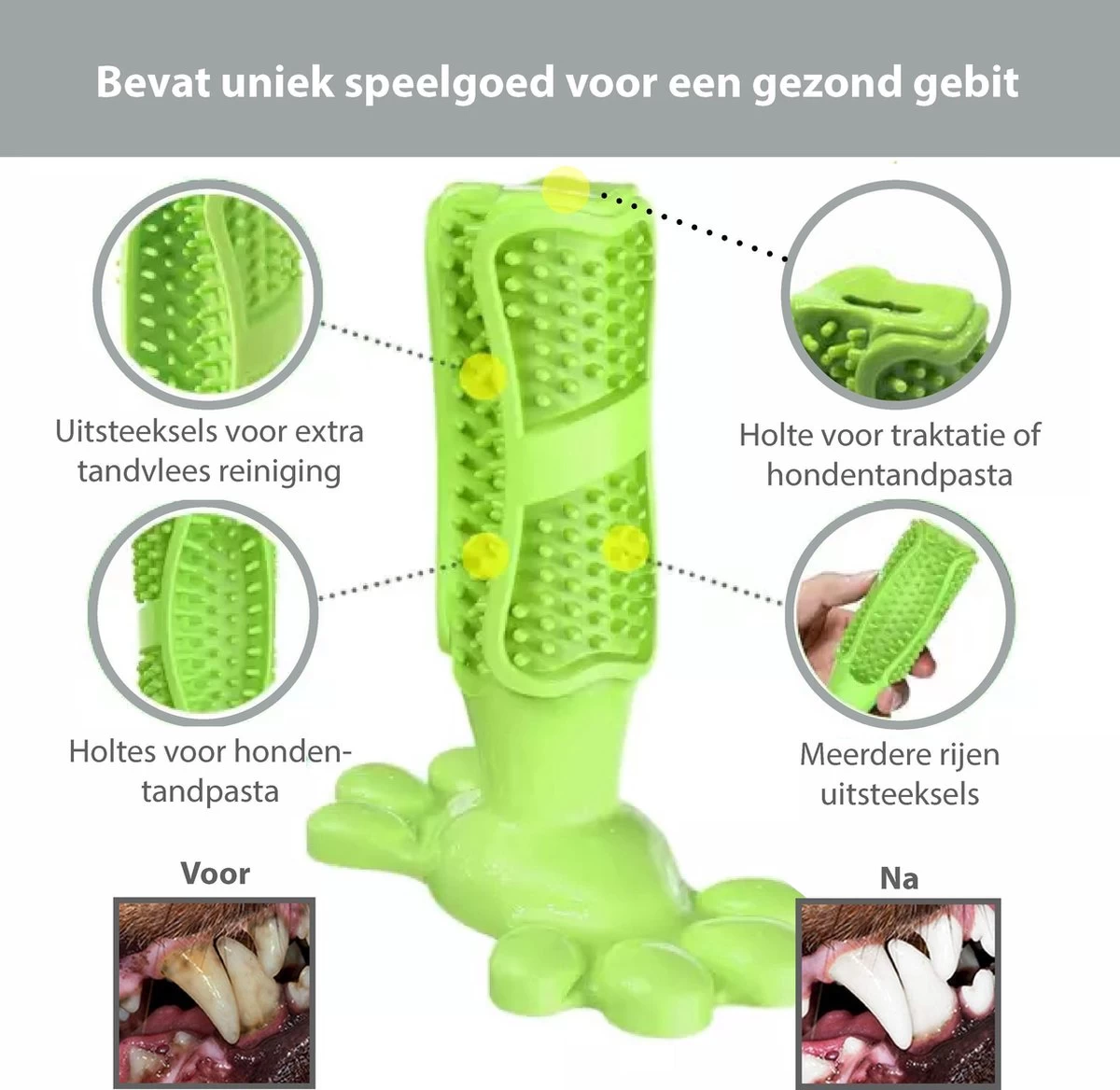 – Voeg hondentandpasta toe aan de groene voet voor een extra schoongebit en gemakkelijke reiniging