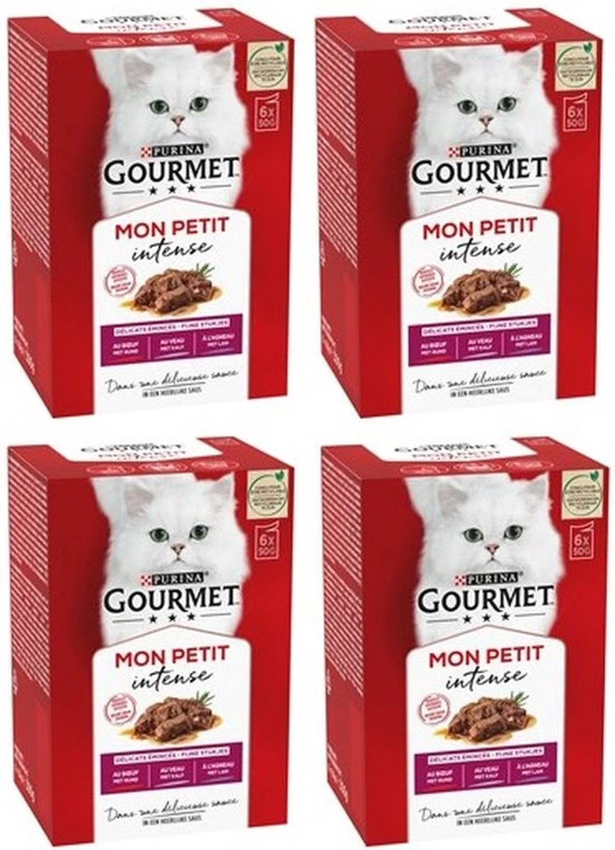 Gourmet Mon Petit Intense Vlees-selectie GOURMETâ„¢ Mon Petit Intense, een verfijnde verzameling van werkelijk verrukkelijke recepten die de essentie van smaak vieren. Gemakkelijk te openen, gemakkelijk te serveren, zonder restjes en in een recyclebaar maaltijdzakje. Al onze heerlijke recepten zijn 100% volledig en gebalanceerd voor volwassen katten.