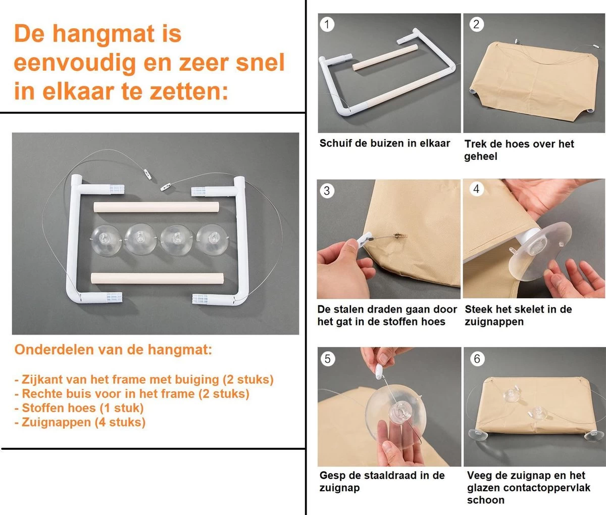 Dit kattenbed in eenvoudig en binnen enkele minuten in elkaar te zetten, en te monteren aan het raam. Zie hiervoor ook bijgevoegde foto met betrekking tot de instructies, en de bijgevoegde handleiding voor een complete uitleg van dit cat bed.