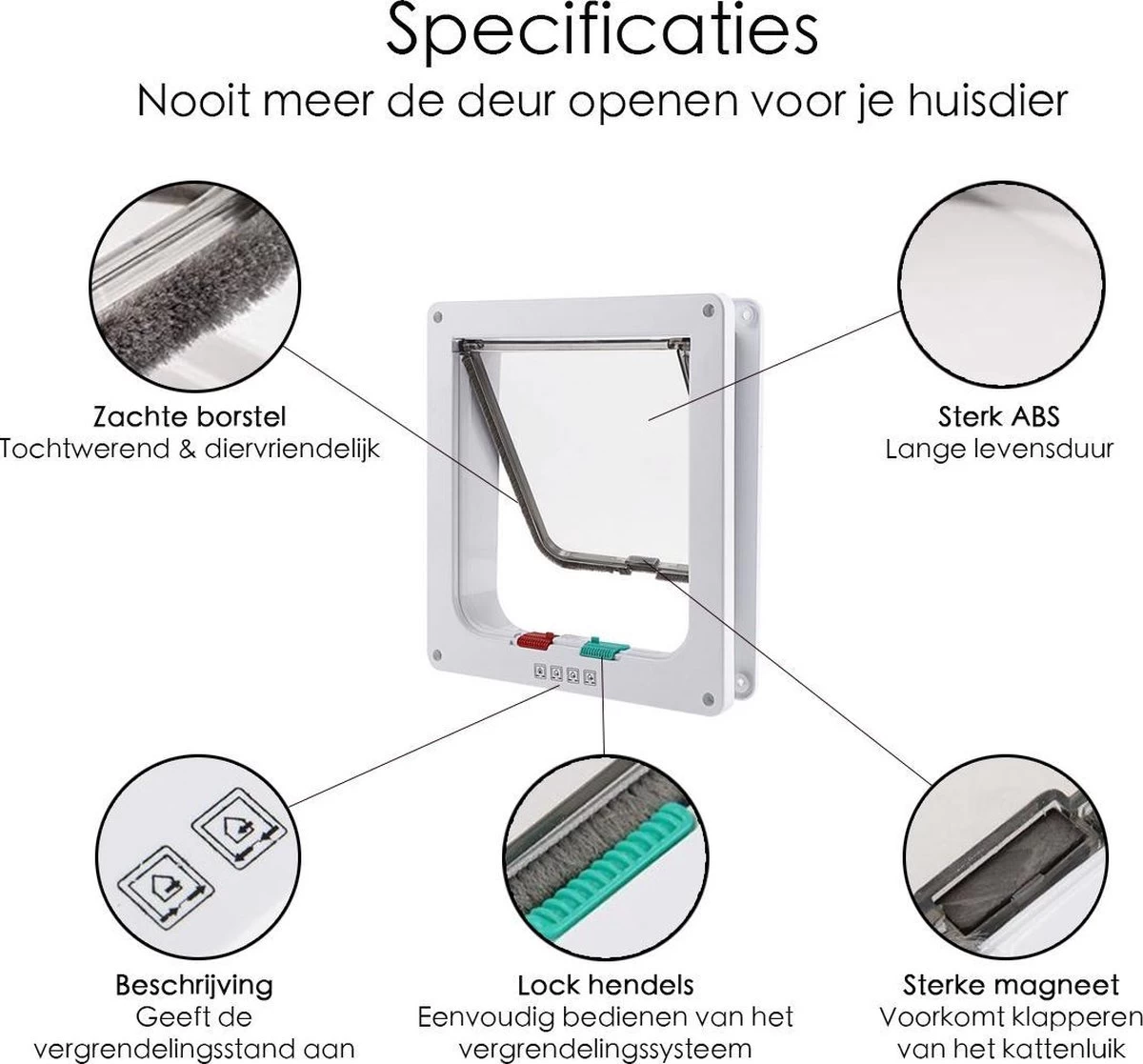Het kattenluik is gemaakt van premium ABS materiaal, waardoor je kat er lekker hard doorheen kan rennen. Ook heeft het luik een zachte binnenrand waardoor het extra veilig is voor jouw huisdier. Aan het luikje zit een magneet waardoor het weer makkelijk dicht gaat. Ook heeft het luik aan de randen zachte borstels, zodat het minder hard dichtklapt en er geen water en kou naar binnen komt.