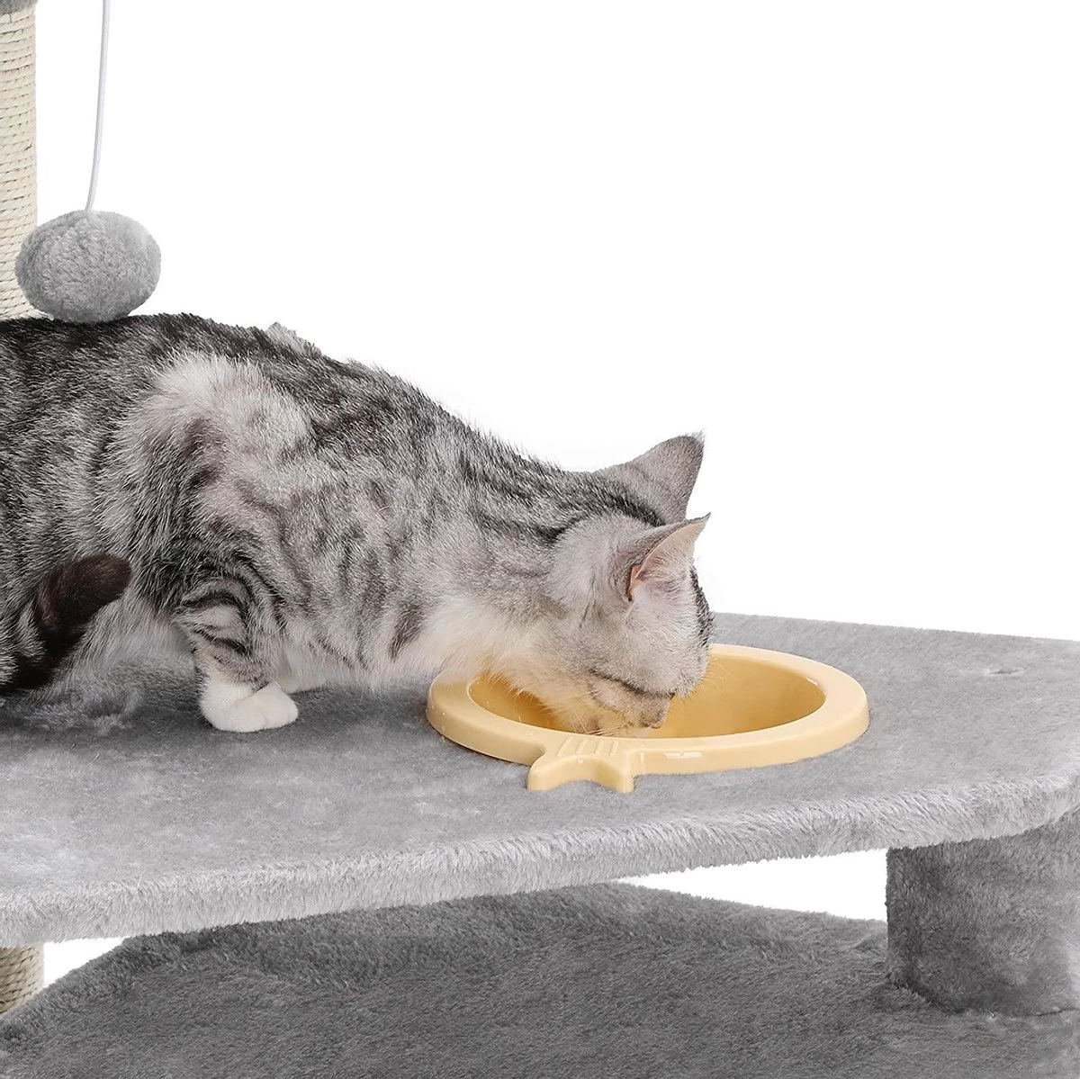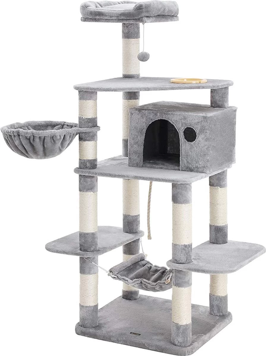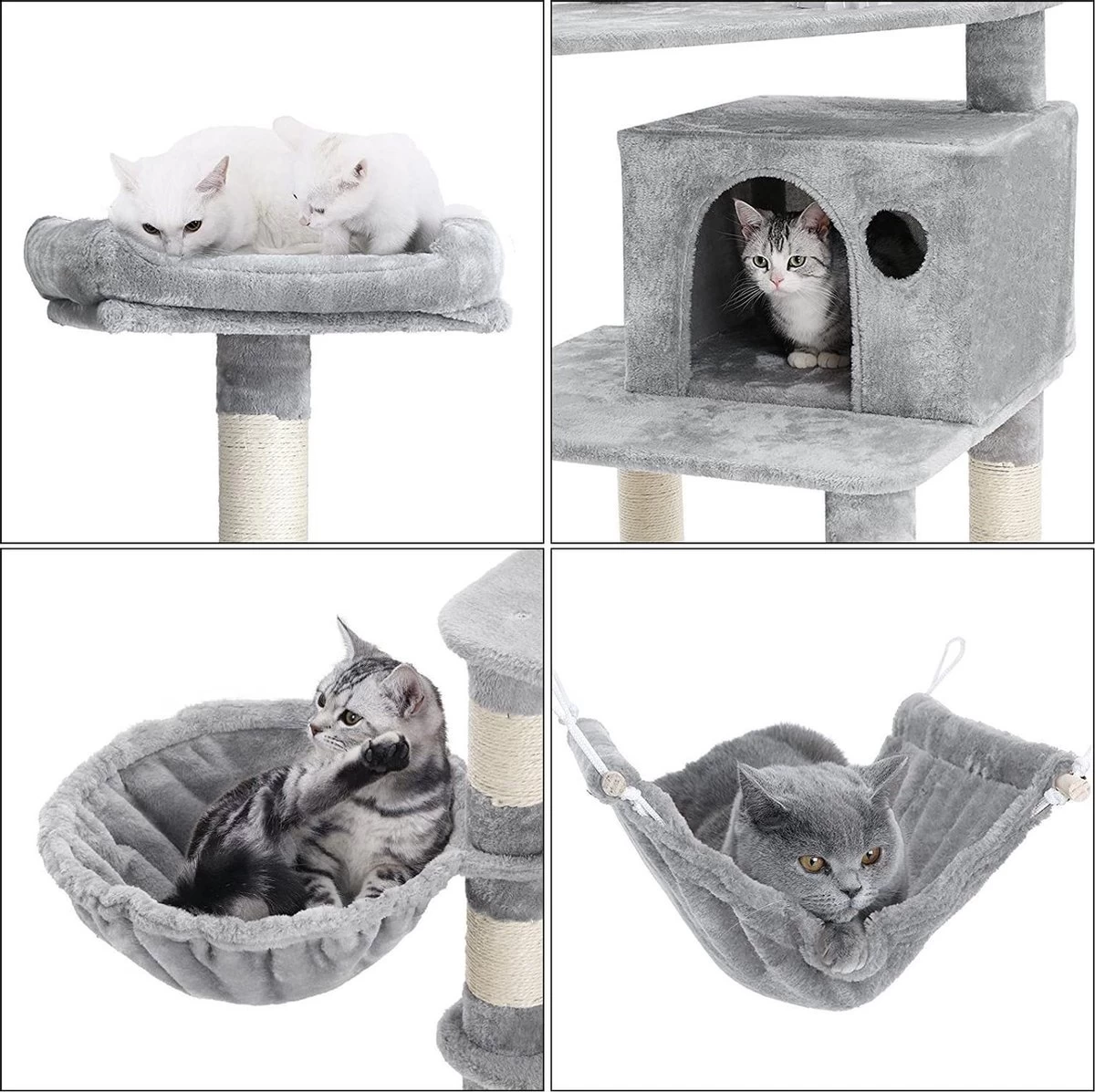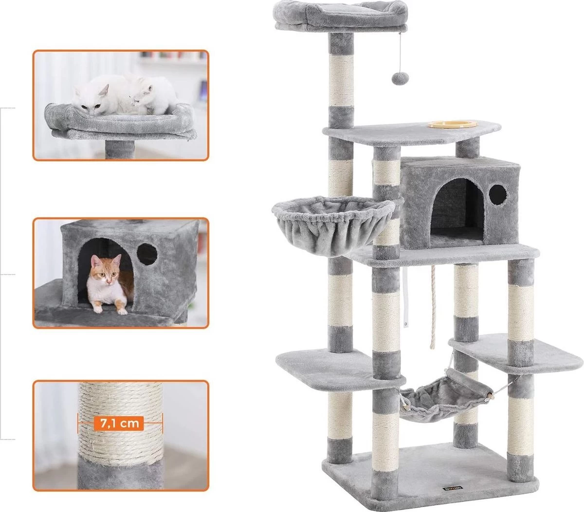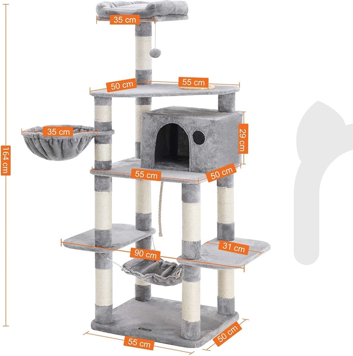 ✔ Uitgerust met verschillende uitzichtplateaus van pluche, een kattenhuisje verschillende krabstammen, speelelementen en een luxe hangmat en hangende kattenmand.