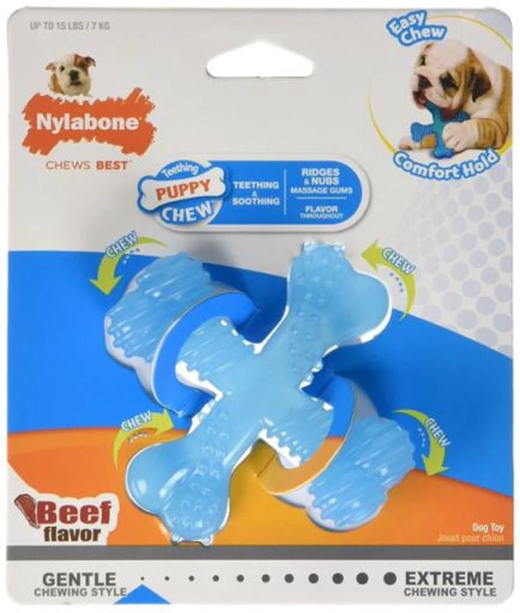 Voor puppy’s die nog niet gewisseld hebben en graag kauwen. Dit Nylabone kauwbot voor doorkomende tandjes in kruisvorm heeft een heerlijke rundvleessmaak die niet verloren gaat tijdens het kauwen. Het materiaal is iets zachter en flexibeler dan de botten in ons Extreme-assortiment, en daardoor zachter voor de bek van uw puppy. Het gebruik van een Nylabone kauwbot bevordert een gezonde, niet-destructieve manier van kauwen.