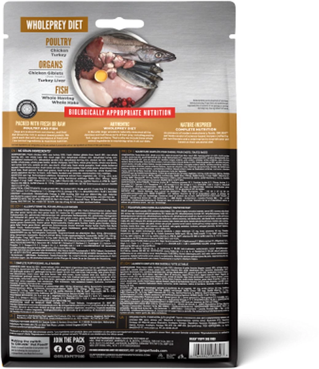 | Voedingswaarde | Vers kippenvlees (13%), Vers kalkoenvlees (7%), Verse eieren (7%), Verse<br />haring(6%), Verse kippenlevertjes (6%), Verse Pacifische Pijltandheilbot (5%), Verse<br />kalkoenlever (5%), Verse kippenhartjes (4%), Verse kalkoenhartjes (4%), Verse<br />kippenniertjes (4%), Kippenvlees (gedr, 4%), Kalkoenvlees (gedr, 4%), Hele<br />makreel (gedr, 4%), Sardine (gedr, 4%), Haring (gedr, 4%),<br />Kippenvet (4%), Haringolie (3%), Hele rode linzen, Hele groene erwten, Hele groene<br />linzen, Hele kikkererwten, Hele gele erwten, Linzen vezel, Hele Kievitsbonen,<br />Witte bonen, Kippenbot en kraakbeen (1%), Kippenlevertjes (gevriesdroogd),<br />Kalkoen lever (gevr.droogd), Verse pompoen, Verse muskuspompoen, Courgette,<br />Pastinaak, Verse wortelen, Verse Red Delicious appels, Verse Bartlett peren,<br />Verse groene boerenkool, Verse spinazie, Rode bieten loof, Raapstelen, Verse<br />cranberries, Verse bosbessen, Saskatoon bessen, Gedroogde bruine zeewier,<br />Cichoreiwortel, Kurkuma, Mariadistel, Kliswortel, Lavendel, Heemstwortel,<br />Rozenbottels. |