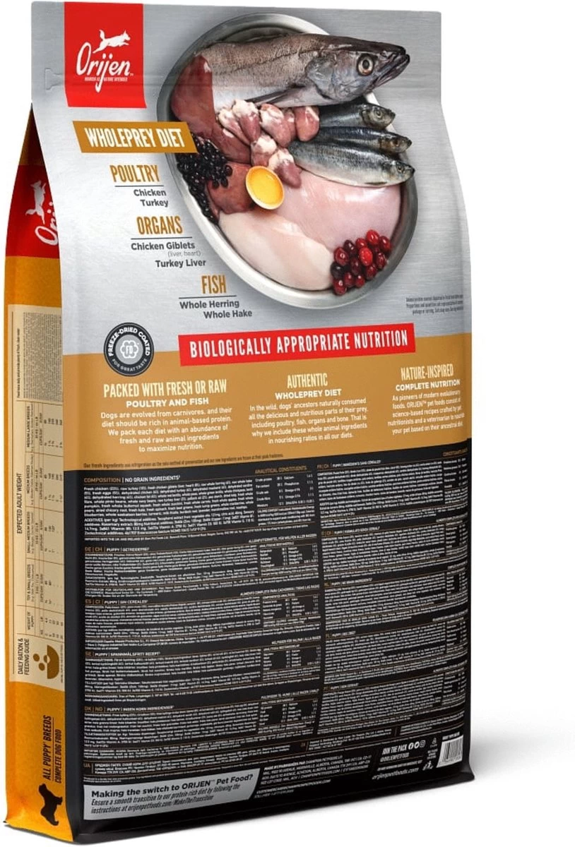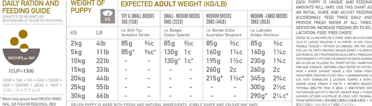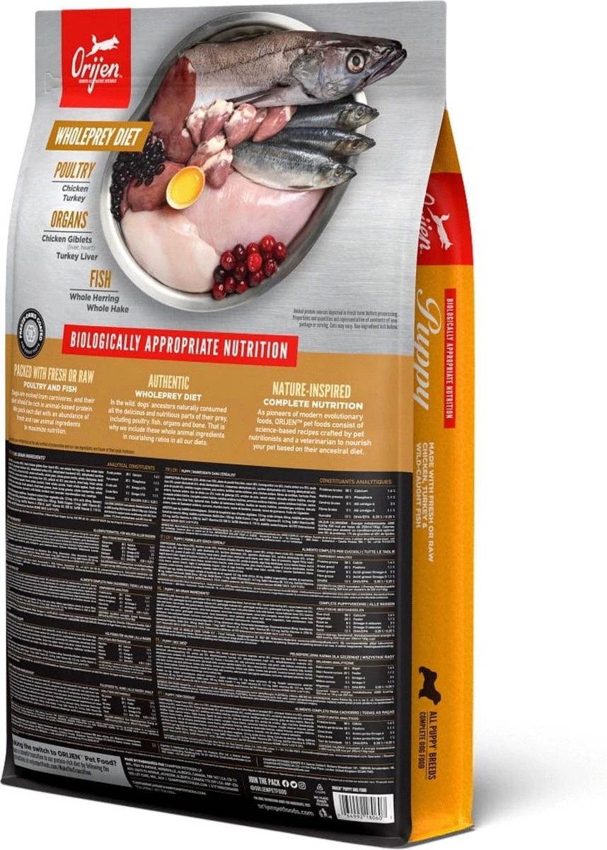 Orijen Puppy 6 kgIeder puppy is geëvolueerd als carnivoor, met een natuurlijke behoefte aan een voeding rijk en gevarieerd van vers vlees en verse vis aangevuld met kleine hoeveelheden groeten, fruit en grassen. Daarom wordt Biologically Appropriate™ Orijen Puppy bereid met scharrel kippen- en kalkoenvlees, scharreleieren en in het wild gevangen vis. Alles is gekweekt of gevangen op/in Canadese boerderijen of wateren en dagelijks vers geleverd. Daardoor rijk aan hoogwaardige voedingsstoffen om jouw hond volledig te voeden!Bereid uit de beste en meest verse Canadese ingrediënten, in de bekroonde keukens. Orijen Puppy complete voeding houdt jouw puppy hond gelukkig, gezond en sterk. SamenstellingVers kippenvlees (20%)*, gedroogd kippenvlees (15%), verse kippenlever (4%)*, verse hele haring (4%)*, vers kalkoenvlees (4%)*, gedroogd kalkoenvlees (4%), verse kalkoen lever (3%)*, verse hele eieren (3%)*, verse gefileerde snoek (3%)*, verse hele zalm (3%)*, verse kippen hartjes (3%)*, kippen kraakbeen (3%), gedroogde haring (3%), gedroogde zalm (3%), kippen lever olie (3%), *kippenvet (2%), rode linzen, groene erwten, groene linzen, zongedroogde alfalfa, yams, erwtenvezels, kikkererwten, pompoen, muskaatpompoen, spinazie, wortelen, Red Delicious appelen, Barlett peren, veenbessen, bosbessen, zeewier, zoethout, engelwortel, fenegriek, goudsbloem, venkel, pepermunt blad, kamille, paardenbloem, bonenkruid, rozemarijn. (*) Ingrediënten zijn vers aan de bereiding toegevoegd!Analytische BestanddelenRuw eiwit (min.) 38%, ruw vet (min.) 20%, ruwe as (max.) 8%, ruwe celstof (max.) 5%, vocht (max.) 10%, calcium (min/max.) 1.3/1.6% fosfor (min/max.) 1.0/1.3%, *Omega – 6 (min.) 3.0%, *Omega – 3 (min.) 1.2%, *DHA (min.) 0.6%, *EPA (min.) 0.3%, Glucosamine (min.) 1500 mg/kg, *Chondroitine sulfaat (min.) 1200 mg/kg. Toevoegingsmiddelen (per kg): Nutritionele toevoegingen: Vitamine A: 15000 IU. Vitamine D3: 2000 IU, E1 (IJzer): 40 mg, E2 (Jodium): 3 mg, E4 (Koper): 13 mg, E5 (Magnesium): 14 mg, E6 (Zink): 150 mg, E8 (Selenium): 0.3 mg – Zoötechnische toevoegingen: Enterococcus faecium NCIMB10415: 300 MLN CFU/kg. Inhoud: 6 kg.