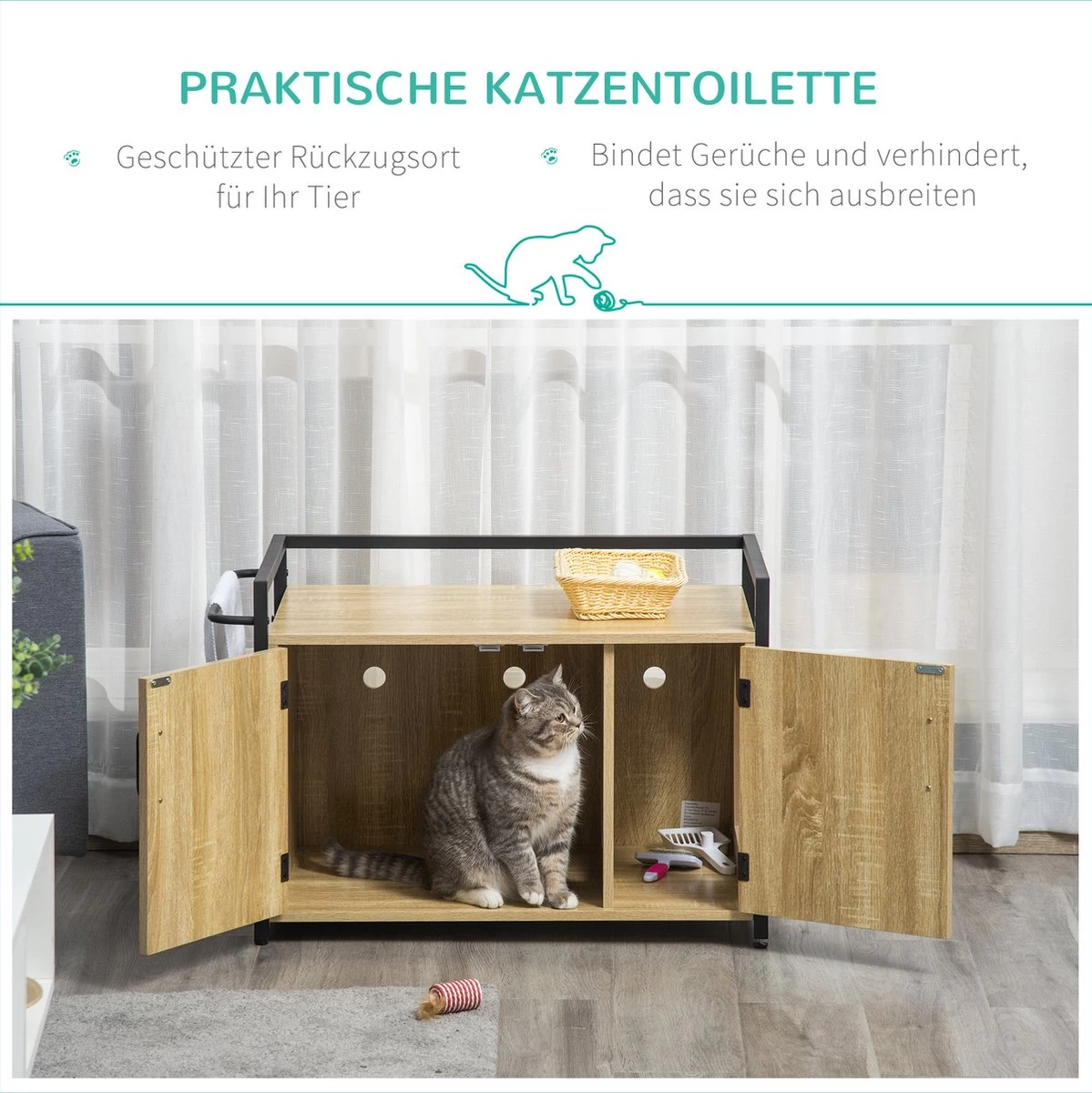 Die Katzentoilette besteht aus strapazierfähiger MDF-Platte mit widerstandsfähiger Beschichtung. Es ist ein sicheres und geschützter Raum für ihre Katze und bietet ihr viel Privatsphäre. Die magnetische Tür an der Vorderseite ermöglicht das einfache Einsetzen einer Katzentoilette. Der Seiteneingang ermöglicht ihrer Katze einen leichten Eintritt. Dieses Katzenklo erleichtert das Zusammenleben von Katze und Mensch.