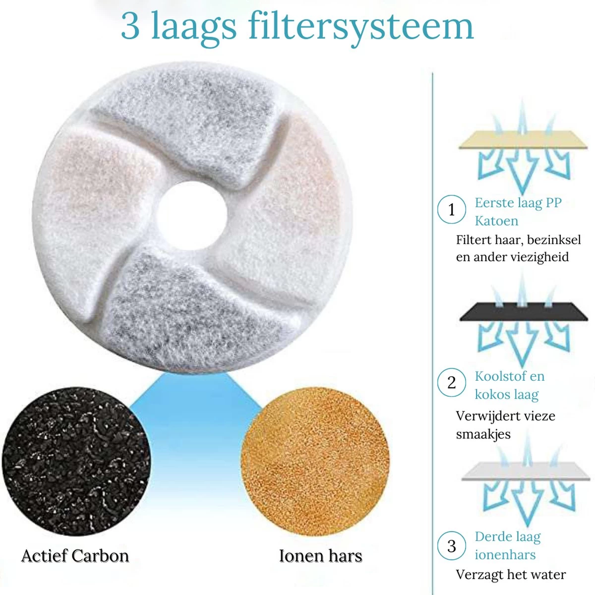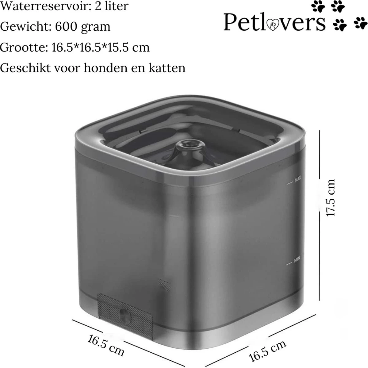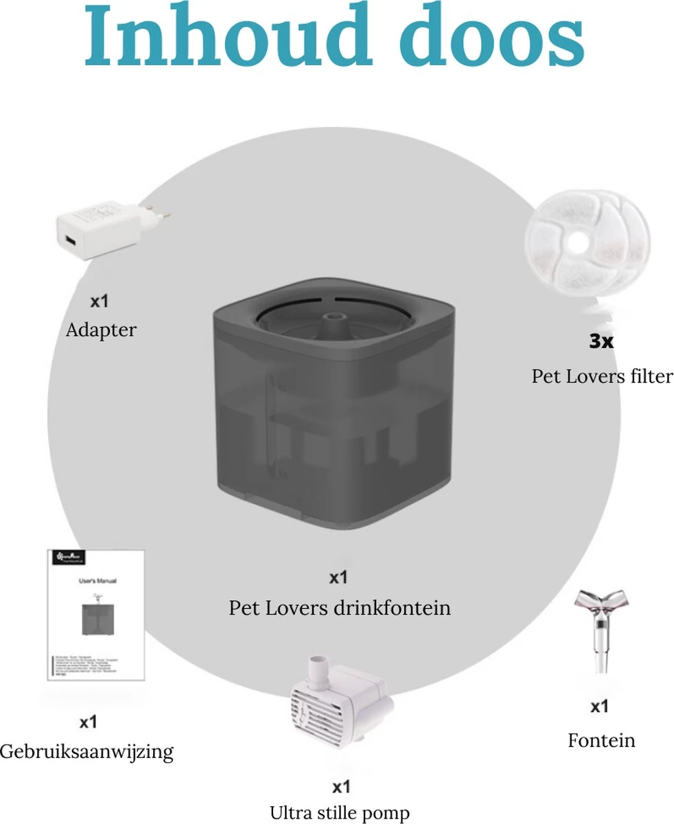 De Pet Lovers drinkfontein zorgt ervoor dat uw hond of kat altijd is voorzien van vers water. Honden en katten hebben een grote voorkeur voor het drinken van stromend water. Daarnaast wordt het water ieder moment van de dag gezuiverd door het circulatiesysteem met de hoogst zuiverende filters bestaande uit: katoen, kokosnoot actief kool en ionenwisselaar zodat uw huisdier geen bacteriën binnen krijgt. De drinkfontein maakt bijna geen geluid, heeft een enorm laag energieverbruik en heeft een superstrak design!