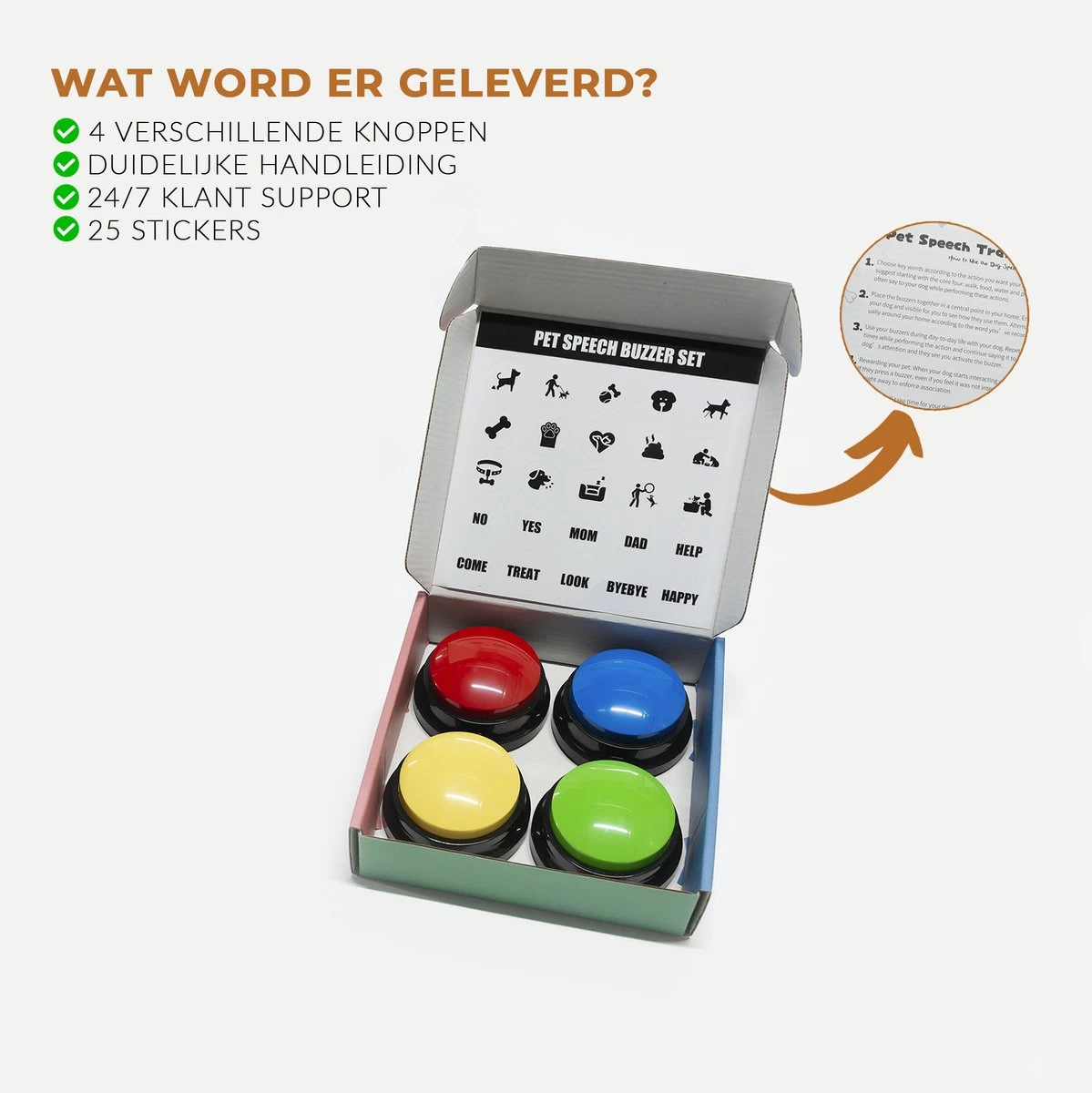 Naast de vier kleurrijke zoemers met verschillende zinnen, bevat de Dog Speech Buzzers Set ook stickers die je kunt gebruiken om elke zoemer te labelen. Deze stickers maken het gemakkelijk om te identificeren welke zoemer overeenkomt met welke zin, zodat u en uw hond gemakkelijk met elkaar kunnen communiceren.