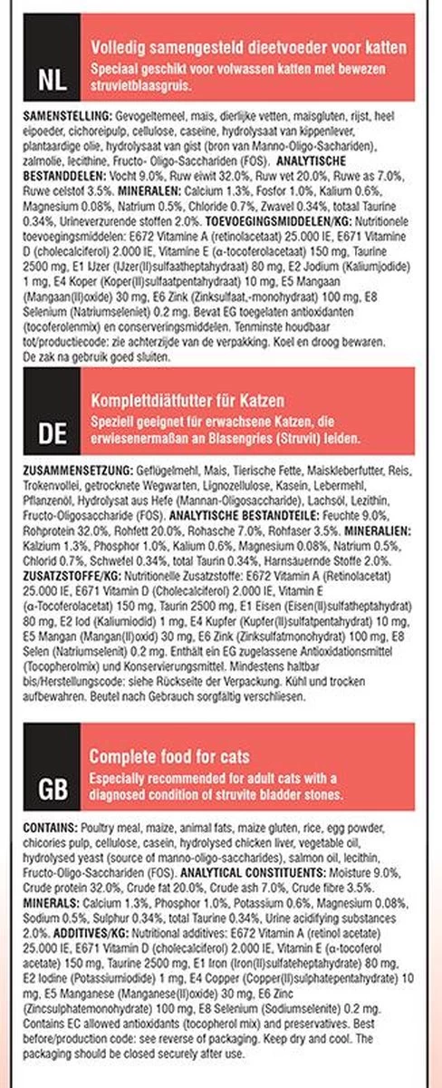 LET OP: Deze voeding is niet geschikt voor: kittens, drachtige of zogende poezen, katten met andere vormen van blaasgruis en bij hart- of nierproblemen. Ook wordt langdurig voeren zonder controle van een dierenarts sterk afgeraden.
