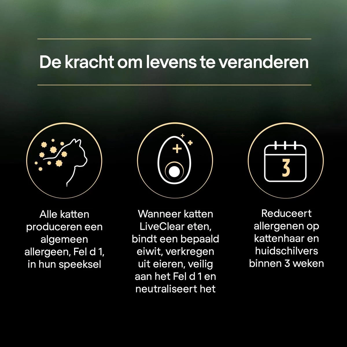 | Bijzonder voedingsdoel | Na drie weken dagelijks voeren vermindert de hoeveelheid allergenen op haar en huidschilfers van katten op een veilig en effectieve manier |