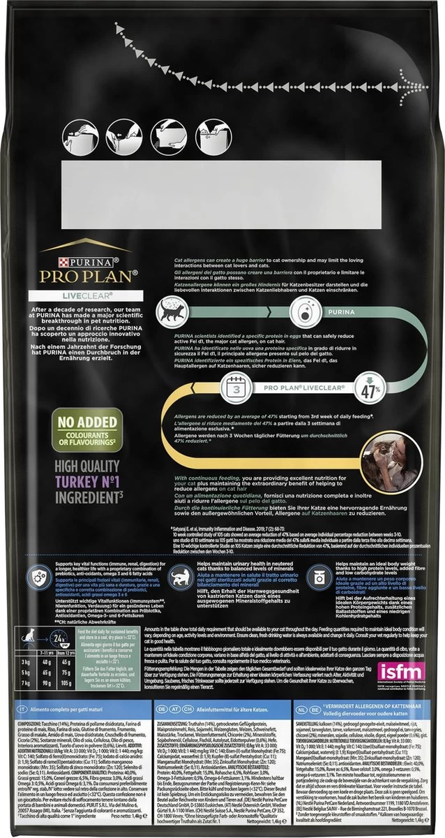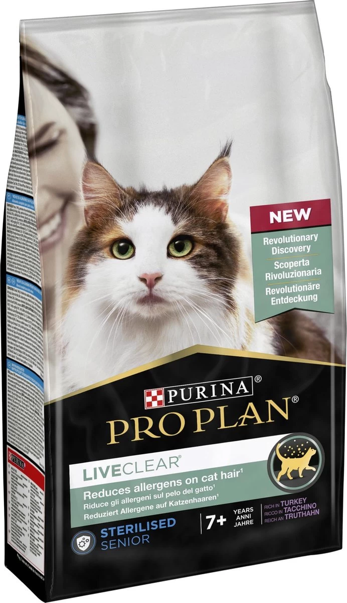 PRO PLAN® LiveClear® diervoer voor gesteriliseerde katten is een smakelijke, 100% complete, evenwichtige en uitstekende dagelijkse voeding die de hoeveelheid allergenen op haar en huidschilfers van katten na drie weken dagelijks voeren veilig en effectief vermindert. Rijk aan kalkoen en speciaal ontworpen voor senior katten ouder dan 7 jaar.