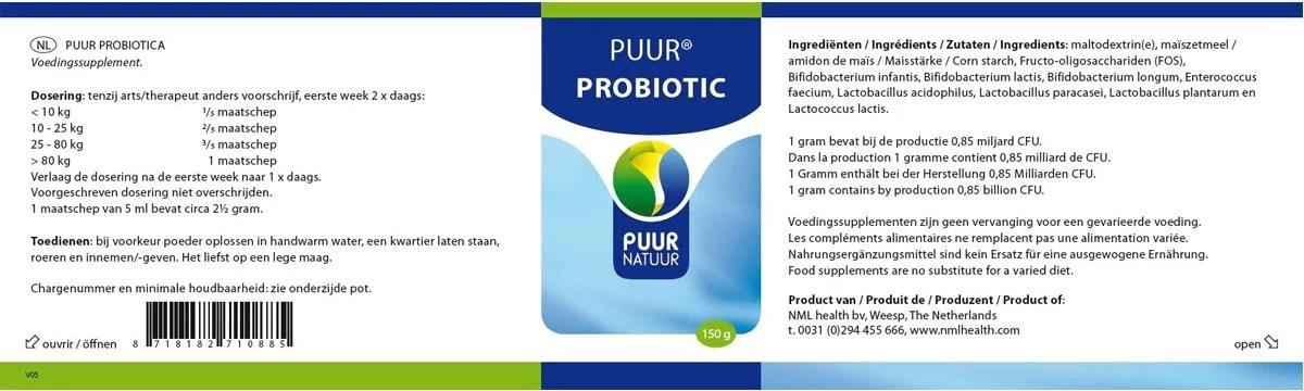 Samenstelling per 2½ gram: Overige ingrediënten: Fructo Oligo Sacchariden.Toevoegingsmiddelen per 2 ½ gram: Zoötechnische toevoegingsmiddelen, darmflorastabilisatoren: Bifidobacterium infantis, Bifidobacterium lactis, Bifidobacterium longum, Enterococcus faecium (ATCC #8043), Lactobacillus acidophilus (ARS #B-3208), Lactobacillus paracasei (LPC-01), Lactobacillus plantarum (ATCC #8014), Lactococcus lactis (LL-01) en Saccharomyces cerevisiae.