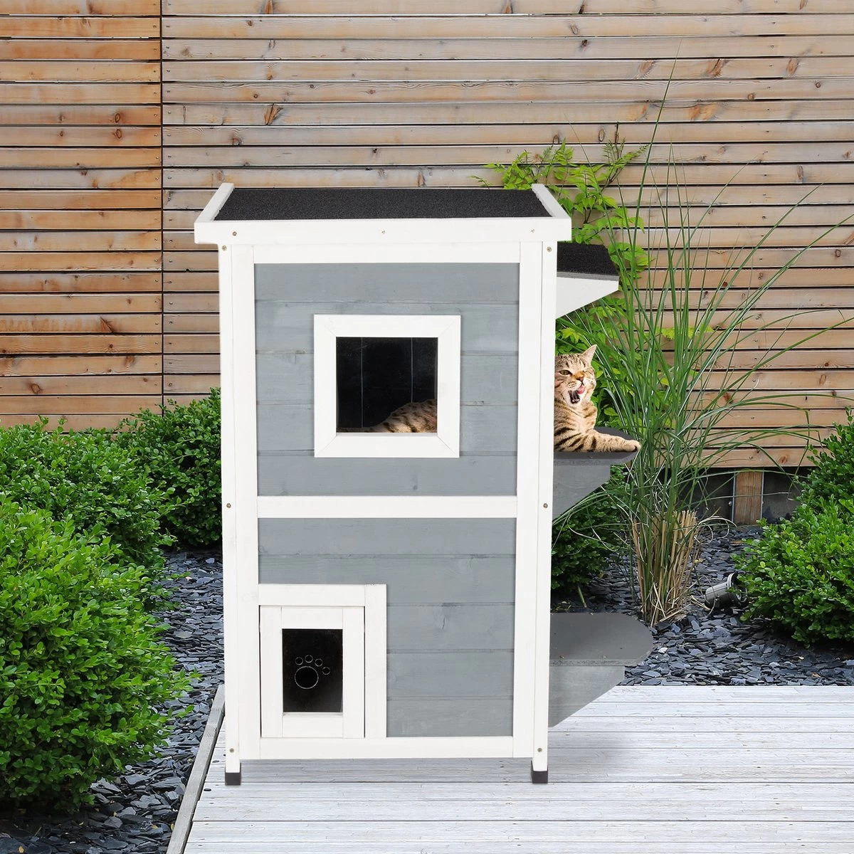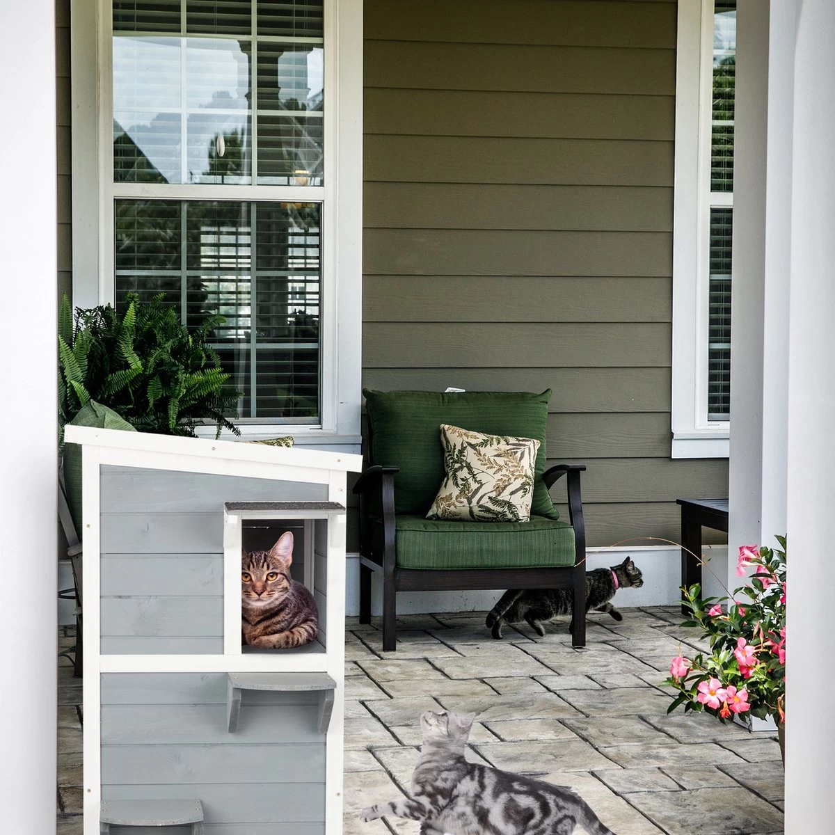 Dit grote kattenhuis met 2 verdiepingen biedt ruimte voor minimaal 2 katten. Het kattenhok beschikt over 2 ruime etages, 3 verschillende ingangen en 2 plateaus. Het dak van het huisje op pootjes is voorzien van weerbestendig dakleer. Het kattenmeubel is daardoor geschikt voor gebruik in de tuin en op het balkon maar komt net zo goed van pas binnenshuis. Dankzij het klapbare dak en de uitneembare bodems is het kattenhuisje snel en makkelijk schoon te maken. Veel speel- en ontdekkingspret voor je kat en weinig werk voor jou.