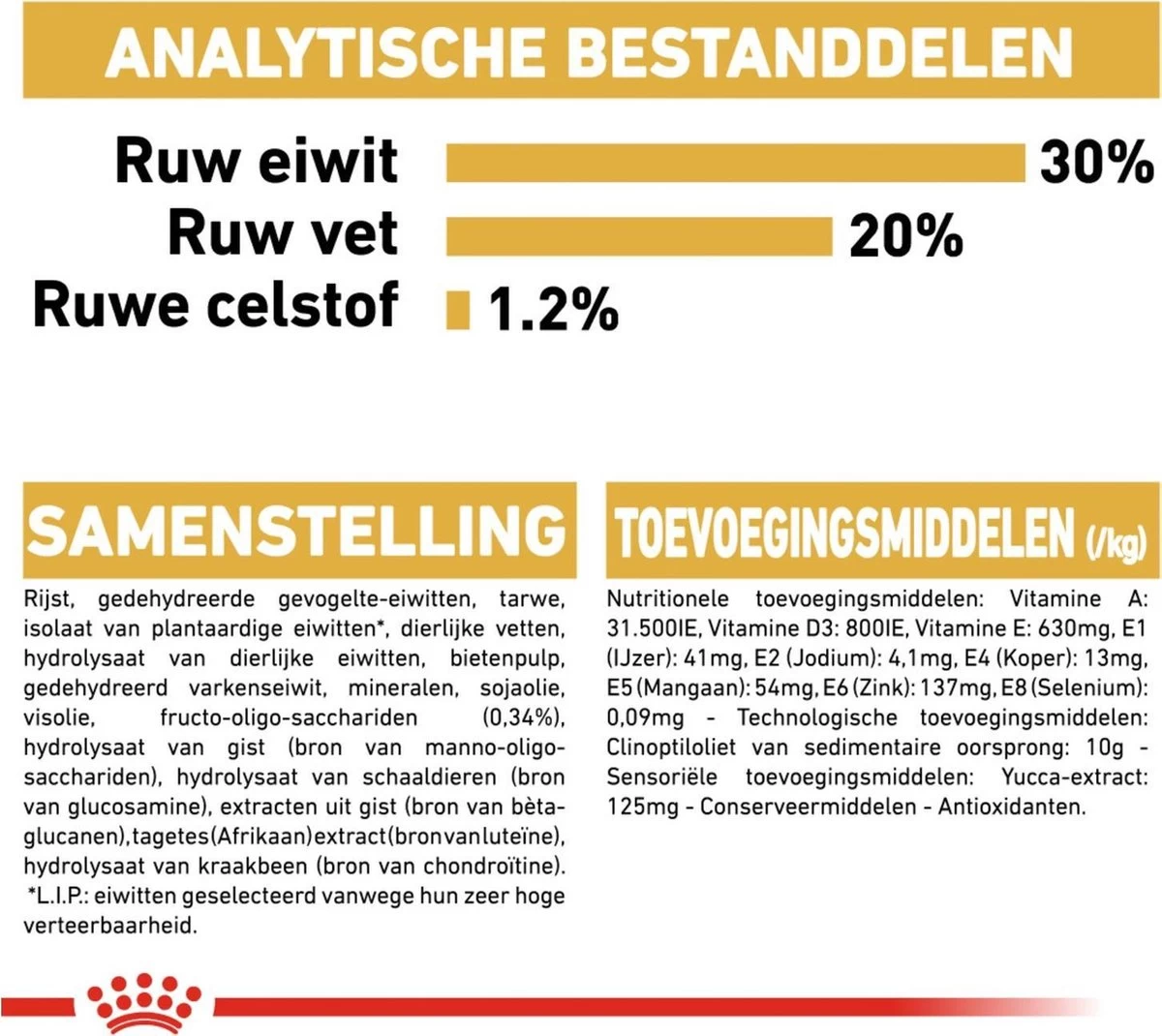 | Voedingswaarde | Samensteling: rijst, gedehydreerde gevogelte-eiwitten, isolaat van plantaardige eiwitten*, tarwe, dierlijke vetten, hydrolysaat van dierlijke eiwitten, bietenpulp, mineralen, gedehydreerd varkenseiwit, sojaolie, visolie, Fructo-Oligo-Sacchariden, hydrolysaat van gist (bron van Manno-Oligo-Sacchariden), hydrolysaat van schaaldieren (bron van glucosamine), tagetes (Afrikaan) extract (bron van luteïne), hydrolysaat van kraakbeen (bron van chondroïtine) |