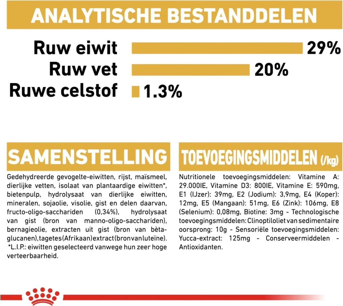 Rijst, gedehydreerd gevogeltevlees, maïsmeel, dierlijke vetten, isolaat van plantaardige eiwitten*, maïsgluten, maïs, hydrolysaat van dierlijke eiwitten, plantaardige vezels, bietenpulp, mineralen, plantaardige oliën (sojaolie, bernagieolie), visolie, gist, Fructo-Oligo-Sacchariden, natriumpolyfosfaat, taurine, hydrolysaat van gist (bron van Manno-Oligo-Sacchariden), DL-methionine, eipoeder, hydrolysaat van schaaldieren (bron van glucosamine), L-tyrosine, extracten uit groene thee en druiven (bron van polyfenolen), L-carnitine, hydrolysaat van kraakbeen (bron van chondroïtine), Tagetes (Afrikaan) extract (bron van luteïne).