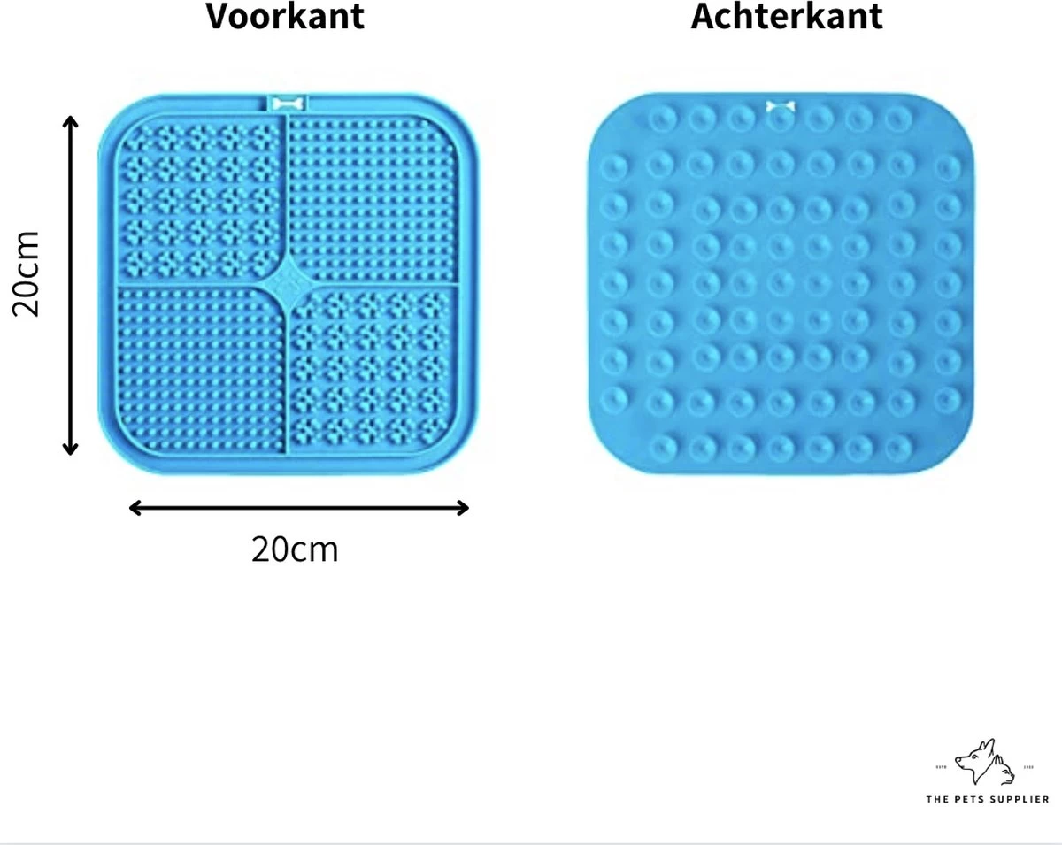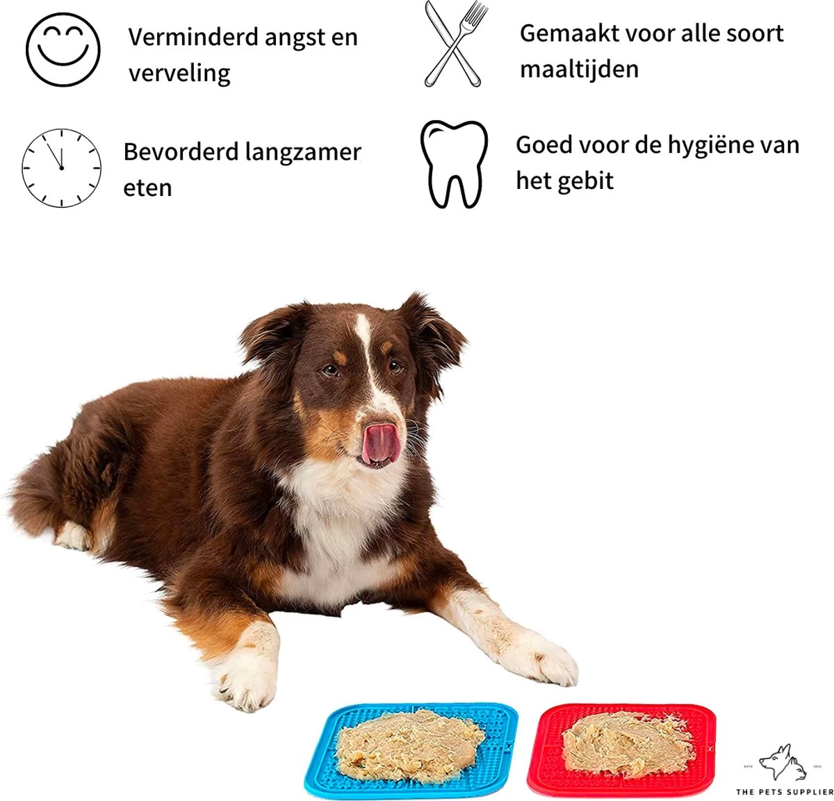 De likmat van The Pets Supplier is een handig hulpmiddel om honden te kalmeren en hun angst, verveling en destructief gedrag te verminderen. Dit komt doordat het herhaaldelijk likken van de mat de endorfines van je huisdier verhoogt, wat ideaal is voor stressvolle tijden zoals het bezoek aan de dierenarts. Ook kan de likmat helpen bij het vereenvoudigen van het douchen van je viervoeter.