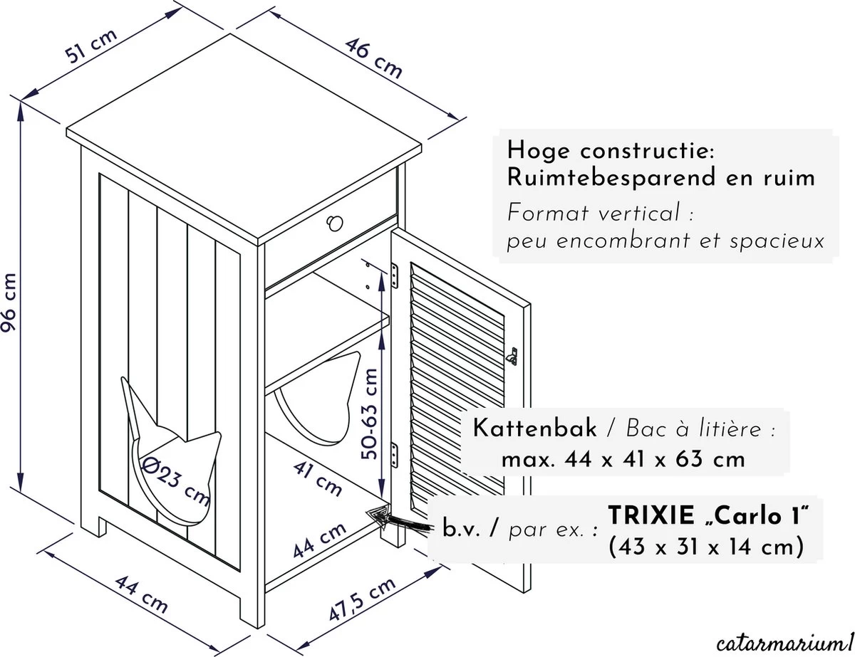 - Hallo, ik ben catarmarium1 uit de WONDERMAKE®-familie, je nieuwe, grote kast om je kattenbak in te verbergen. De gangkast is gemaakt van hardhout en kan ook gebruikt worden als kattenhok met kattenmand. Ik ben 51 cm breed, 46 cm diep en 96 cm hoog; het ingang gat is 23 x 23 cm (2x), binnenmaat 44 x 41 x 50-63 cm (B x D x H)